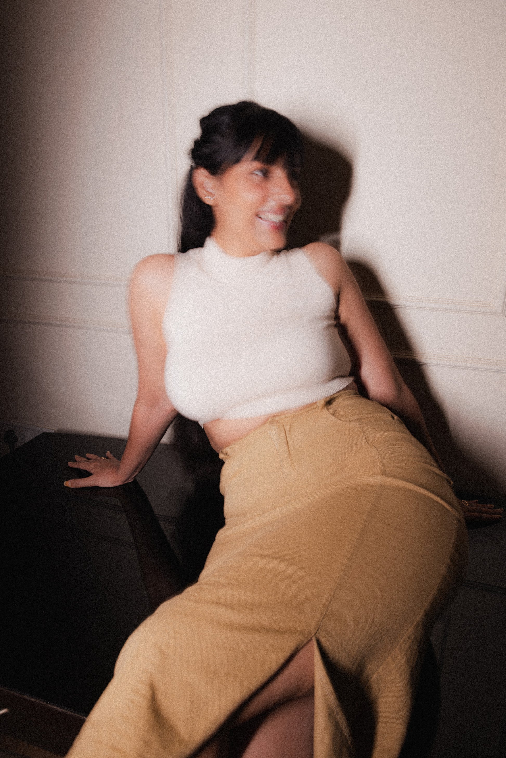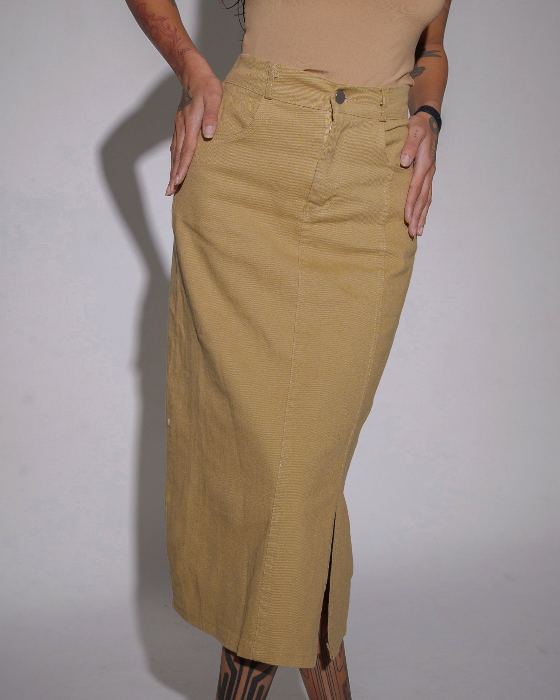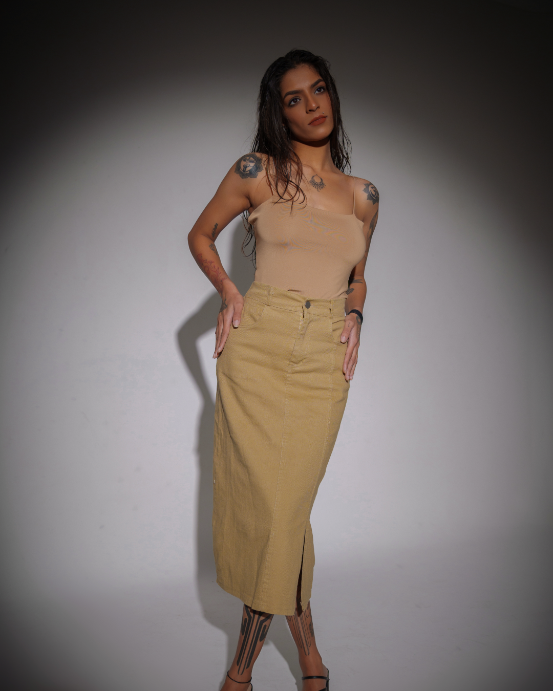 Understated yet striking—the Dust Draft outfit blends cool confidence with minimalist ease. The sleek, nude-toned tank pairs effortlessly with the structured midi skirt, while the front slit adds just the right amount of edge.