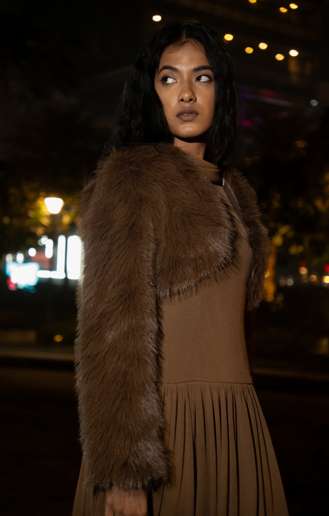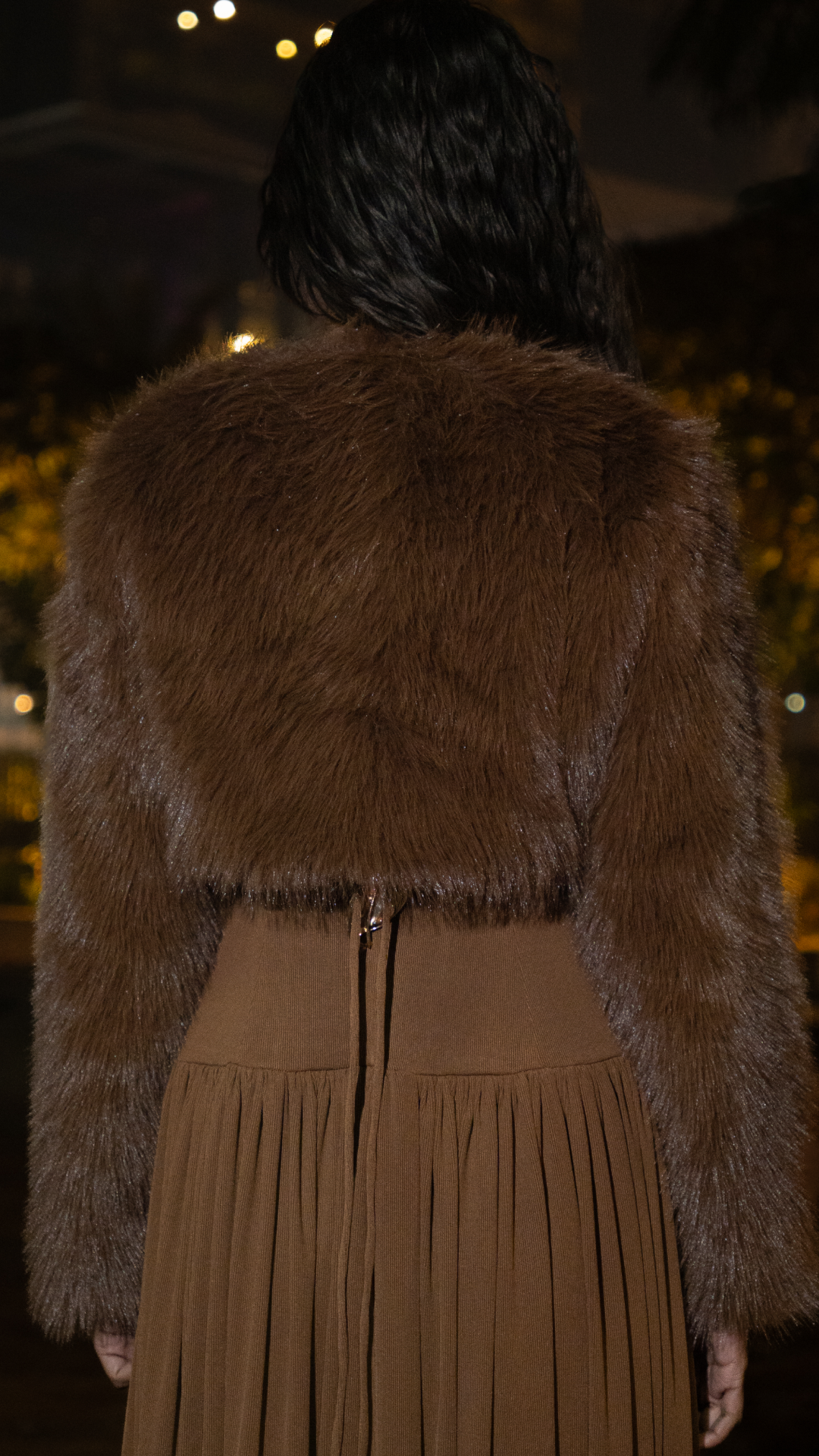Cut in a plush, winter-ready faux fur, this brown jacket wraps you in warmth while keeping a clean, editorial silhouette. Designed to layer effortlessly over everything, it moves with you and adds that quiet, luxe edge to your winter wardrobe.